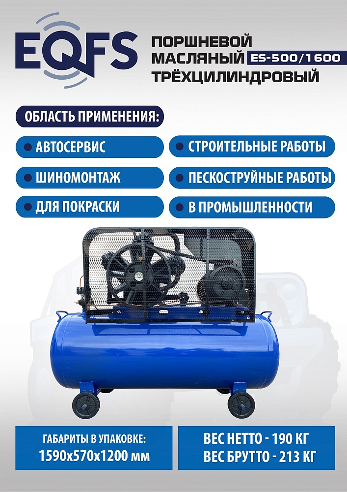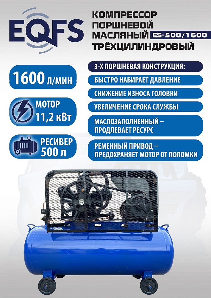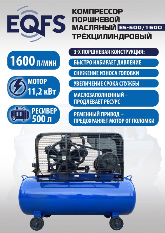 Компрессор воздушный, передвижной, поршневой, масляный, трёхцилиндровый. Быстро достигает нужного давления. Трёхпоршневая головка двигателя уменьшает износ деталей и увеличивает срок службы. Ремённый привод — предохранят мотор от поломки. Идеальное решение для шиномонтажа, автосервиса, строительства, покраски, промышленности. Давление 12,5 Атм. Производительность 1600 л/мин. Мощность 11,2 кВт. Напряжение 380В. Ёмкость ресивера 500 л. Гарантия 12 месяцев.