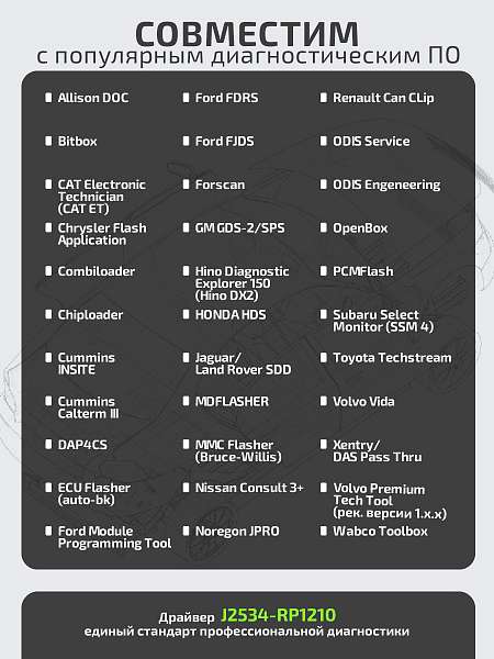 Драйвер J2534-RP1210 для адаптера SM3 даёт возможность работы с большим числом сторонних программ, поддерживающих работу через интерфейс J2534: Allison DOC, Bitbox, CAT Electronic Technician (CAT ET), Chrysler Flash Application, Combiloader, Chiploader, Cummins INSITE, Cummins Calterm III, DAP4CS, ECU Flasher (auto-bk), Ford Module Programming Tool, Ford FDRS, Ford FJDS, Forscan, GM GDS-2/SPS, Hino Diagnostic Explorer 150 (Hino DX2), HONDA HDS, Jaguar/Land Rover SDD, MDFLASHER, MMC Flasher (Bruce-Willis), Nissan Consult 3+, Noregon JPRO, Renault Can CLip, ODIS Service, ODIS Engeneering, OpenBox, PCMFlash, Subaru Select Monitor (SSM 4), Toyota Techstream, Volvo Vida, Xentry/DAS Pass Thru, Volvo Premium Tech Tool (рекомендованы версии 1.х.х), Wabco Toolbox.
