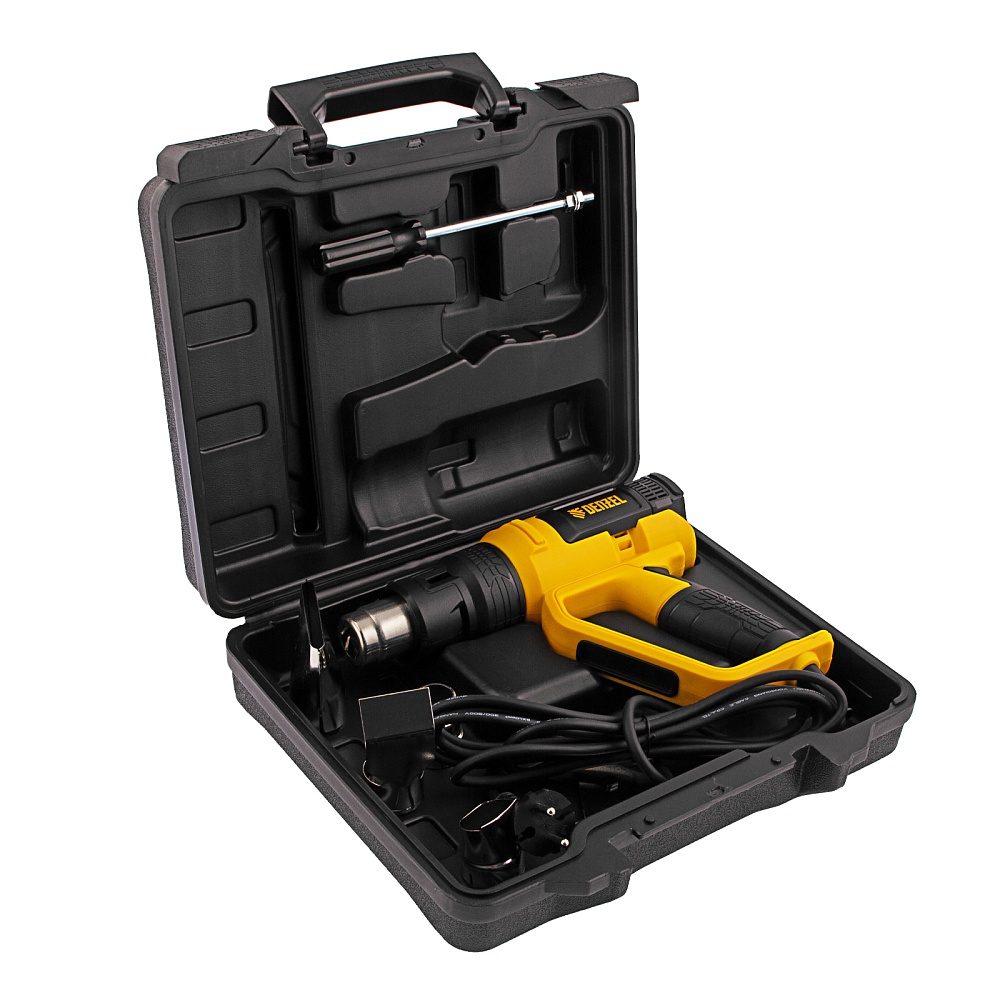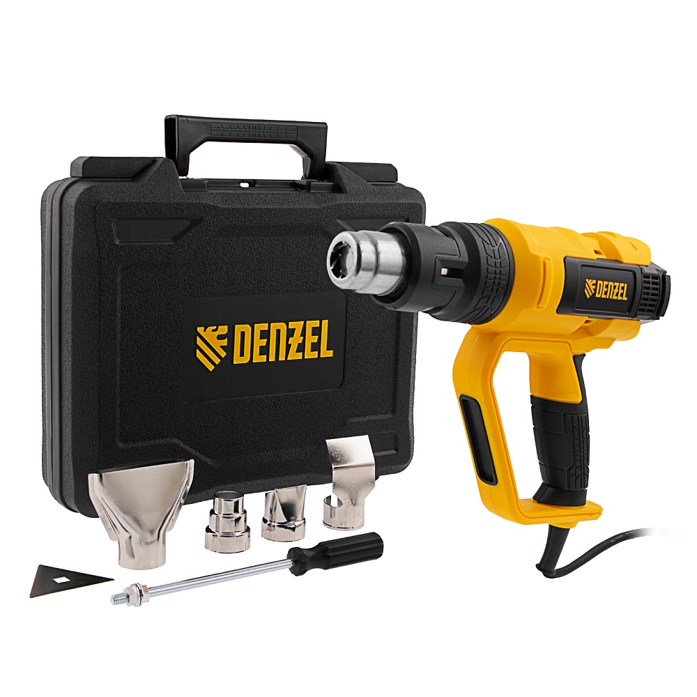 <p>Профессиональный технический фен Denzel HG-2000E 28007 мощностью 2000 Вт, с 2 режимами и LCD дисплеем, предназначен для нагрева и сушки различных соединений и поверхностей. Применяется при снятии лакокрасочных покрытий, удалении старого линолеума и плитки, пайке металла и сварке пластика, разморозке труб, а также в процессе других задач в быту и на строительных объектах.,Высокая мощность двигателя 2 кВт обеспечивает производительность 250-500 л/мин. Максимальная рабочая температура составляет 650 ℃. Надежный и долговечный нагревательный элемент с керамическим каркасом устойчив к продолжительной эксплуатации.</p><h2>Преимущества</h2><ul><li>Два режима работы — нагрев и продувка с температурой 50-650 и 50 ℃ соответственно (продувка снижает риск перегрева и теплового удара после отключения питания).</li><li>Легкий контроль рабочих параметров — фен оснащен LCD дисплеем.</li><li>Функция памяти — можно сохранить до 4-х настроек температуры и производительности, чтобы быстро перейти к ранее использованному режиму.</li><li>Поддержание необходимой температуры — фен оснащен датчиком обратной связи между блоком управления и нагревательным элементом.</li><li>Удобная настройка — независимая ступенчатая регулировка температуры и производительности расширяет спектр задач, с которыми может справиться фен.</li><li>Защита от перегрева и перегрузки — фен автоматически отключается при возникновении нештатных ситуаций (замыкании спирали, остановке вентилятора, перекрытии выходного отверстия), что исключает его поломку.</li><li>Полная готовность к работе — к устройству прилагается комплект дополнительных насадок.</li><li>Эргономичная и сбалансированная конструкция — фен можно установить на плоской поверхности соплом вверх, избежав отключения при перерыве в работе.</li><li>Комфорт и безопасность — прорезиненная рукоятка D-образной формы хорошо ложится в руку и исключает случайное соприкосновение с разогретой поверхностью.</li><li>Кабель питания длиной 3 м с резиновой изоляцией — можно расширить рабочую зону без помощи удлинителя, работать при температуре от 0 ℃ и без риска поломки подвергать фен кратковременному воздействию высоких температур.</li><li>Удобное хранение и транспортировка — инструмент поставляется в пластиковом боксе.</li><li>Гарантия 3 года — высокое качество фена подтверждено производителем.</li></ul>
