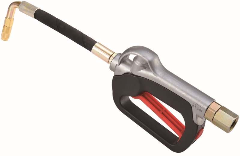 Заправочный пистолет с гибким носиком для масла, ATF, антифриза и технических жидкостей под высоким давлением. Производительность: 50 литров в минуту при рабочем давлении до 100 Бар. Входное отверстие с диаметром резьбы 1/2 дюйма.  Масса: 2 кг. Габариты: 640х300х200 мм. Прочный алюминиевый корпус. Покрытие захвата рукоятки пистолета для масла пластиковое, противоударное.