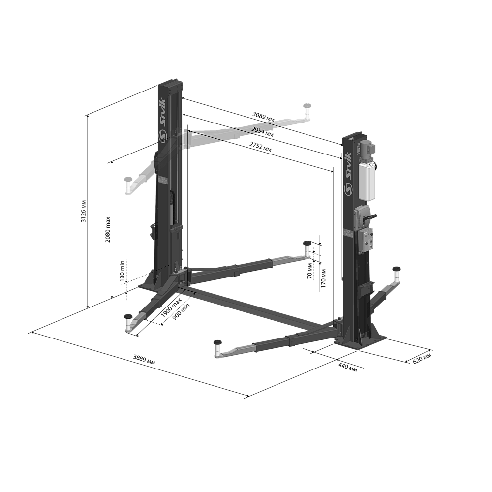 Двухстоечный, высота подхвата, мм:185, Высота подъема, мм:1872-2101 Расстояние между стойками, мм: 3137 Передняя лапа, мм: 952-1834 Задняя лапа, мм: 952-1834 Управление стопорами с одной колонны Регулируемые подъемные проставки