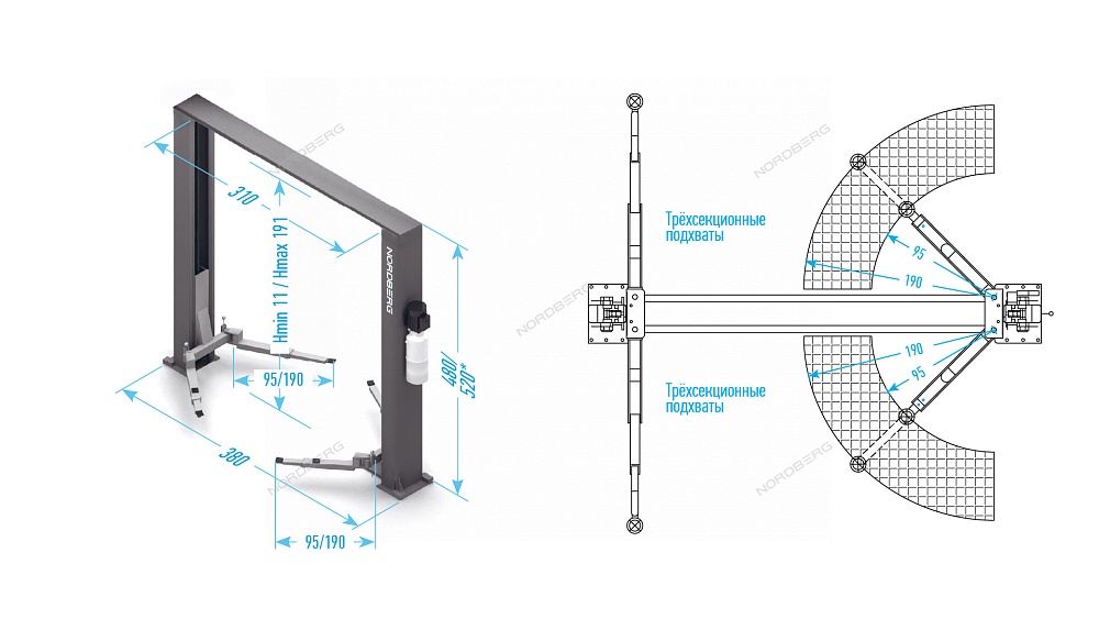 Подъемник 380V 2х стоечный 6т с верхней синхронизацией (синий) LONG NORDBERG N4122H1E-6B купить в Казани цена ✅ - Все для СТО