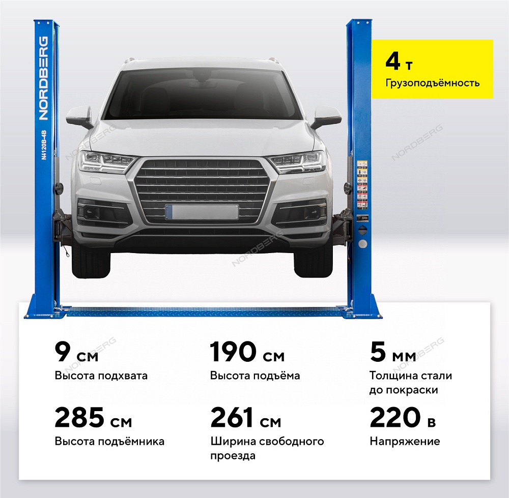 Подъемник двухстоечный 4 т, 220 В, синий NORDBERG N4120B-4B_3+2_220