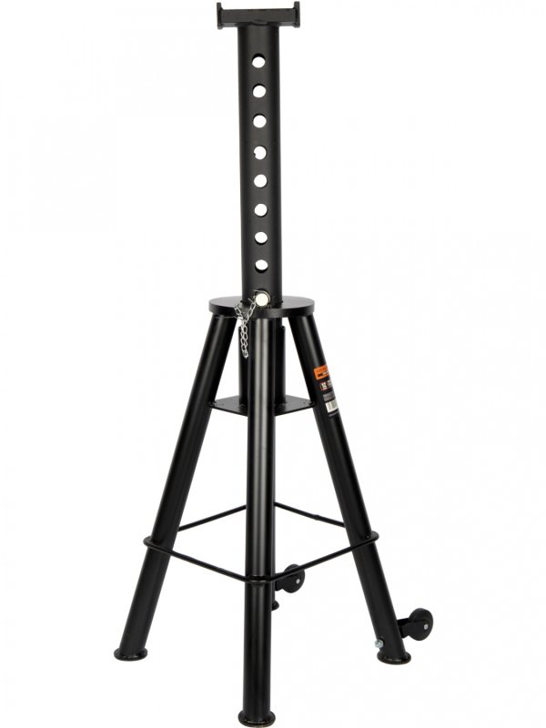 Регулировка высоты осуществляется при помощи выдвижной стойки с отверстиями и фиксирующего штифта. Массивный стопорный штифт надёжно удерживает штангу в выбранном положении. Конструкция выполнена из прочной стали и обеспечивает устойчивую опору и безопасную работу при обслуживании тяжёлого транспорта.