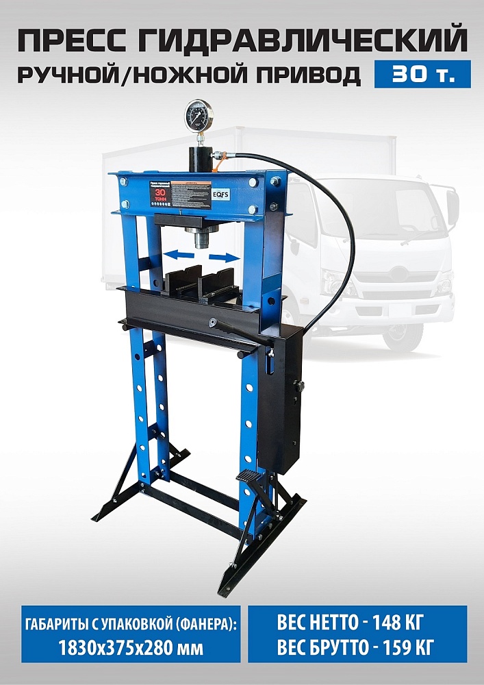 Пресс гидравлический. «Свободные руки» — ножной / ручной. Усилие 30 тонн. Поршень приводится в действие нажатием на ручку или педаль. Рекомендуется для выпрессовки деталей машин, втулок и т.п. в автосервисе, гараже и СТО. Гидроцилиндр с пуансоном имеет возможность перемещения по всей ширине каретки. Цвет синий. Подъёмная площадка регулируется по высоте и фиксируется в требуемом положении. Пуансон 0-160 мм. Рабочее окно 530х980 мм. Доставка по РФ и ТС.