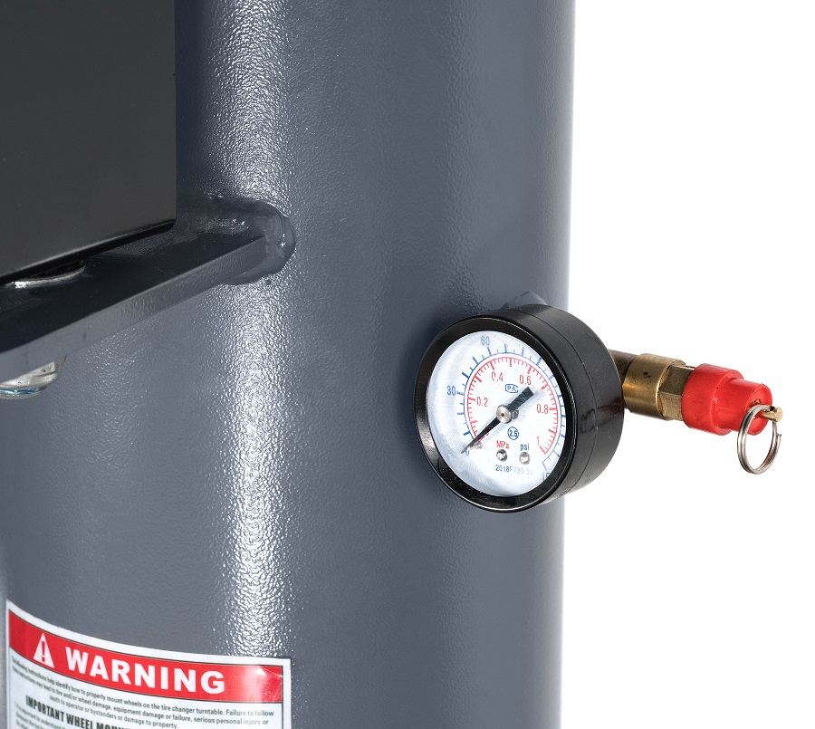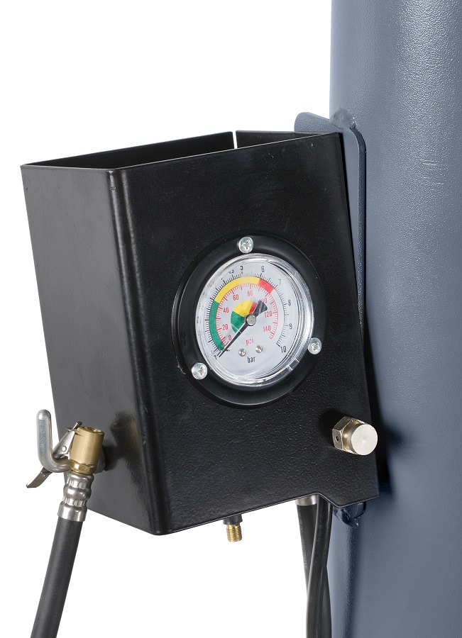Вместо традиционного пистолета для подкачки шин используется шланг с управлением накачкой при помощи педали. Давление воздуха контролируется по манометру, установленному на колонне