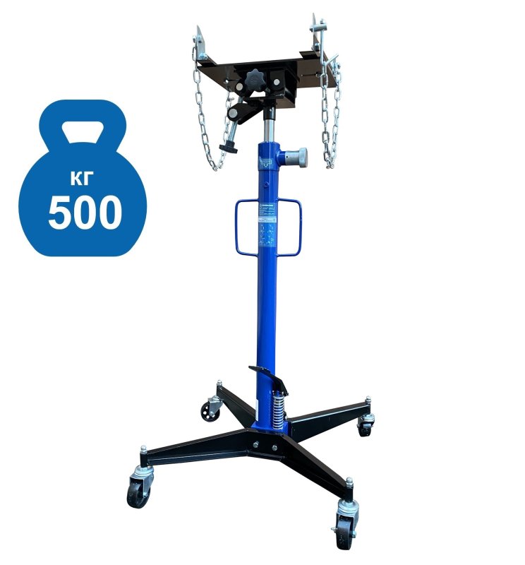 Трансмиссионная стойка грузоподъемностью 500 кг предназначена для монтажа и демонтажа узлов трансмиссий, КПП, тормозных суппортов и других агрегатов на смотровой яме, эстакаде или подъемнике. Оснащена специальной площадкой с цепями для фиксации деталей и транспортировки по цеху. Гидравлический цилиндр с клапанным блоком и возвратной пружиной обеспечивает плавный подъем от 1180 до 2005 мм.