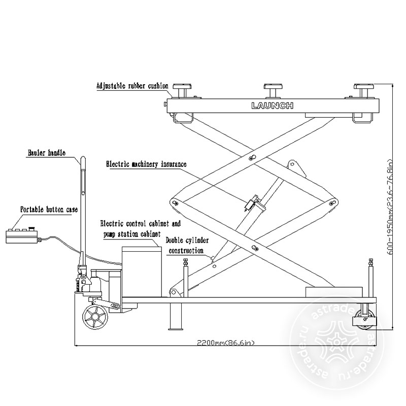 LAUNCH TLT610 - подъемник электрический (с АКБ - поставляется отдельно) для замены АКБ автомобилей, ДВС, коробок передач, ведущих мостов, топливных баков, узлов шасси и других деталей общим весом до 1000 кг. Питается от АКБ (поставляется отдельно). Безопасная и эффективная работа благодаря механической системе безопасности.